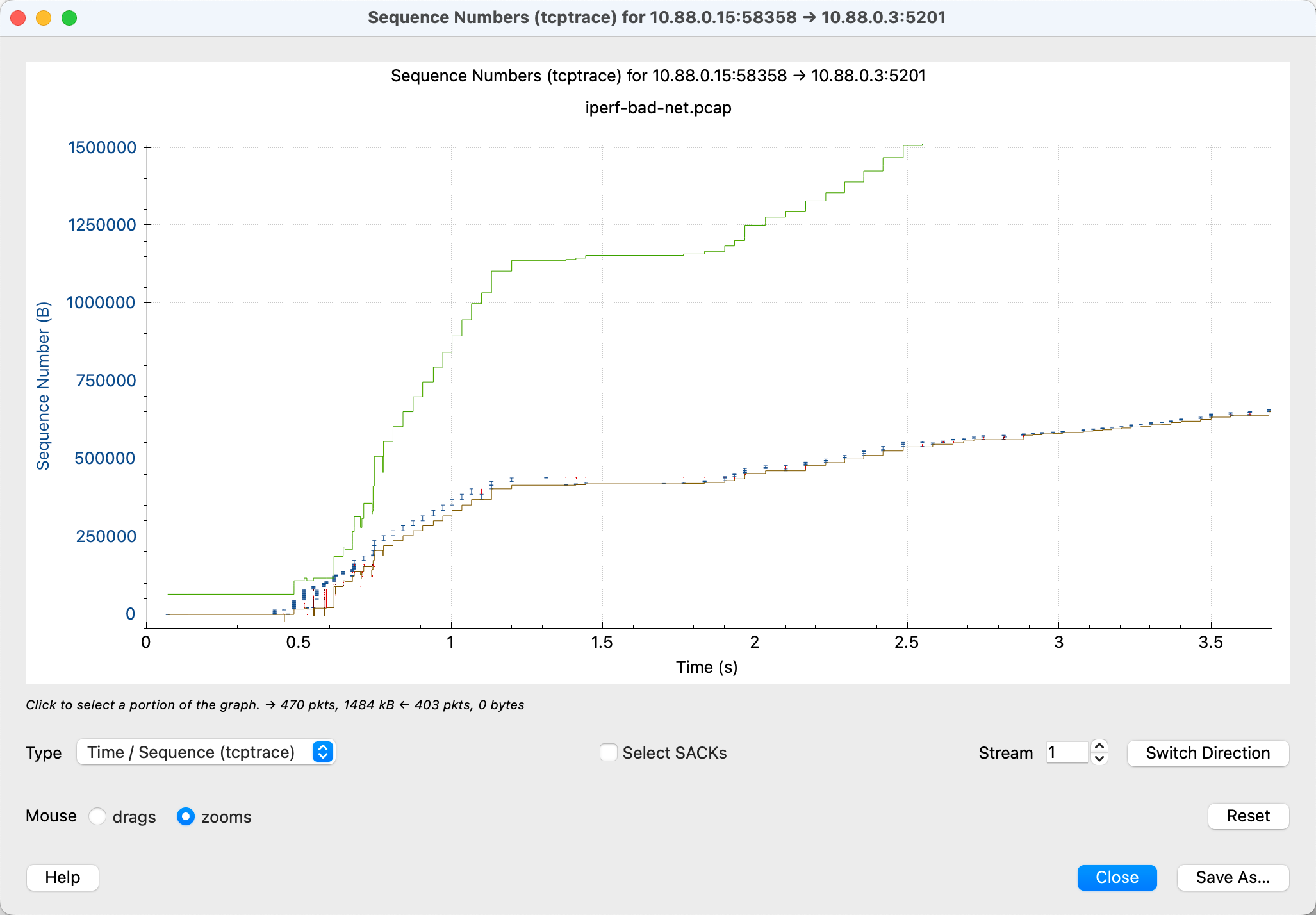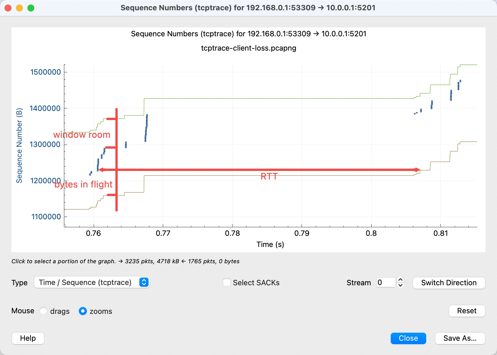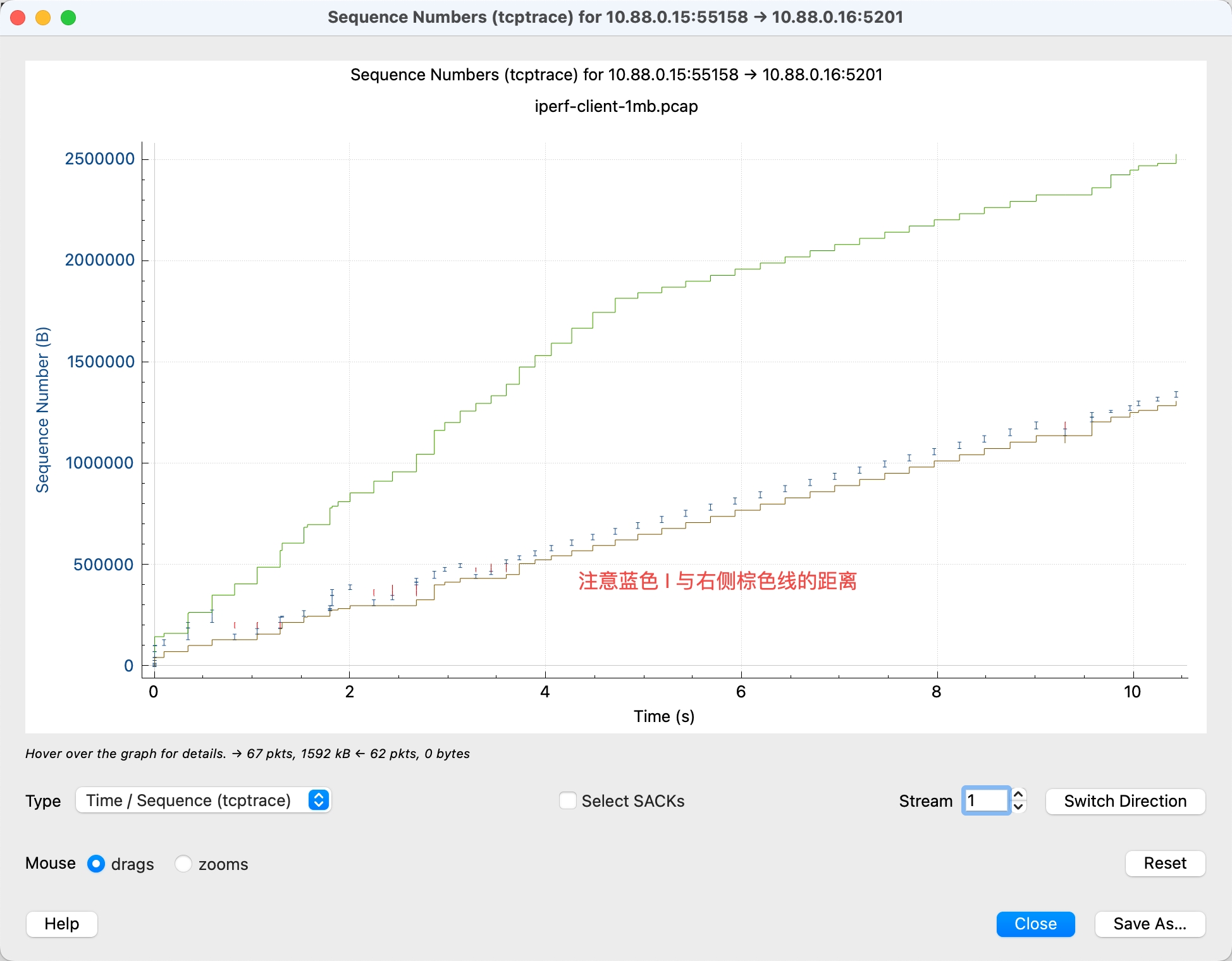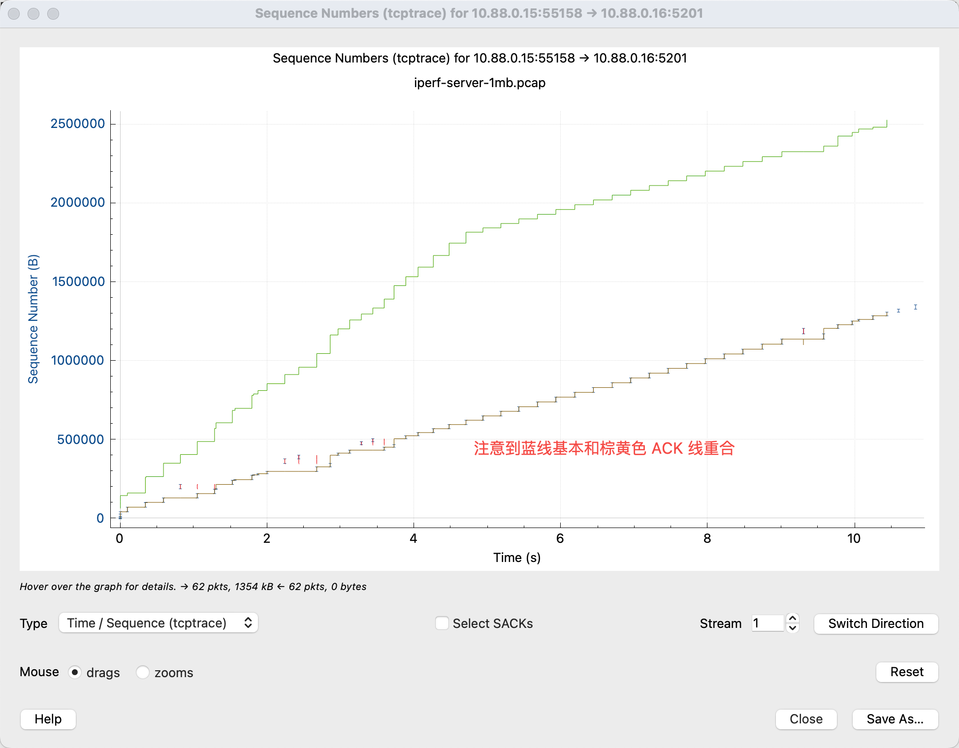 - 横轴是时间,纵轴是 Sequence Number,可以理解为包的字节数