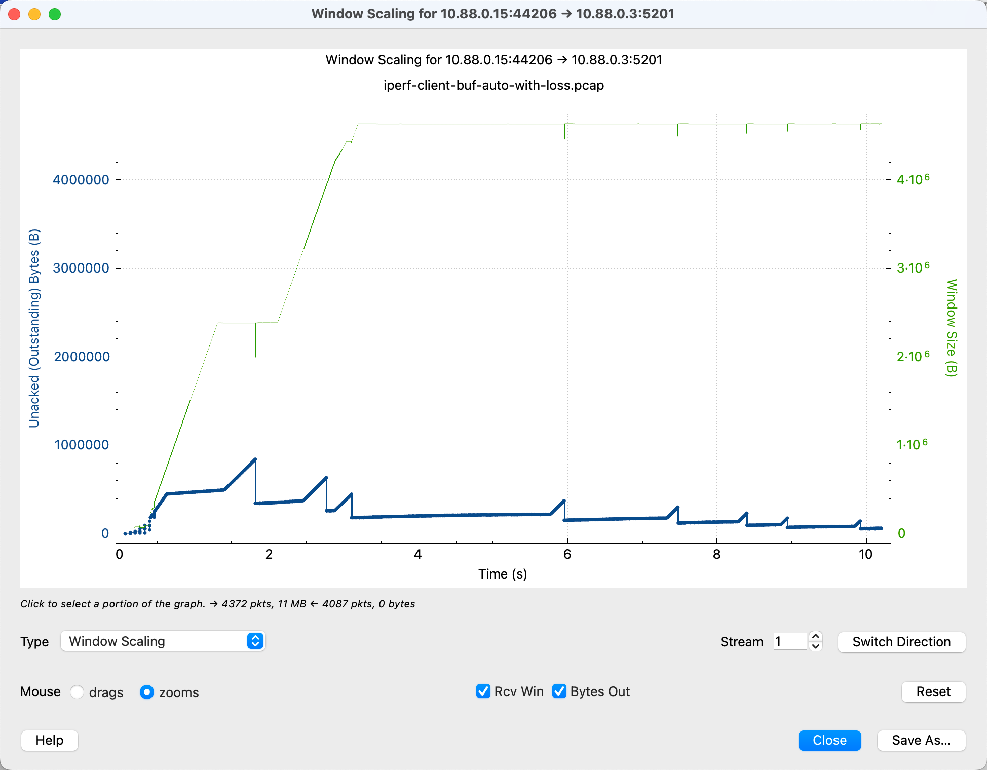 可以看到上图中随着一些丢包的发生,窗口也在不断变化,这与 cwnd 随着 RTT 和丢包不断变化相匹配。