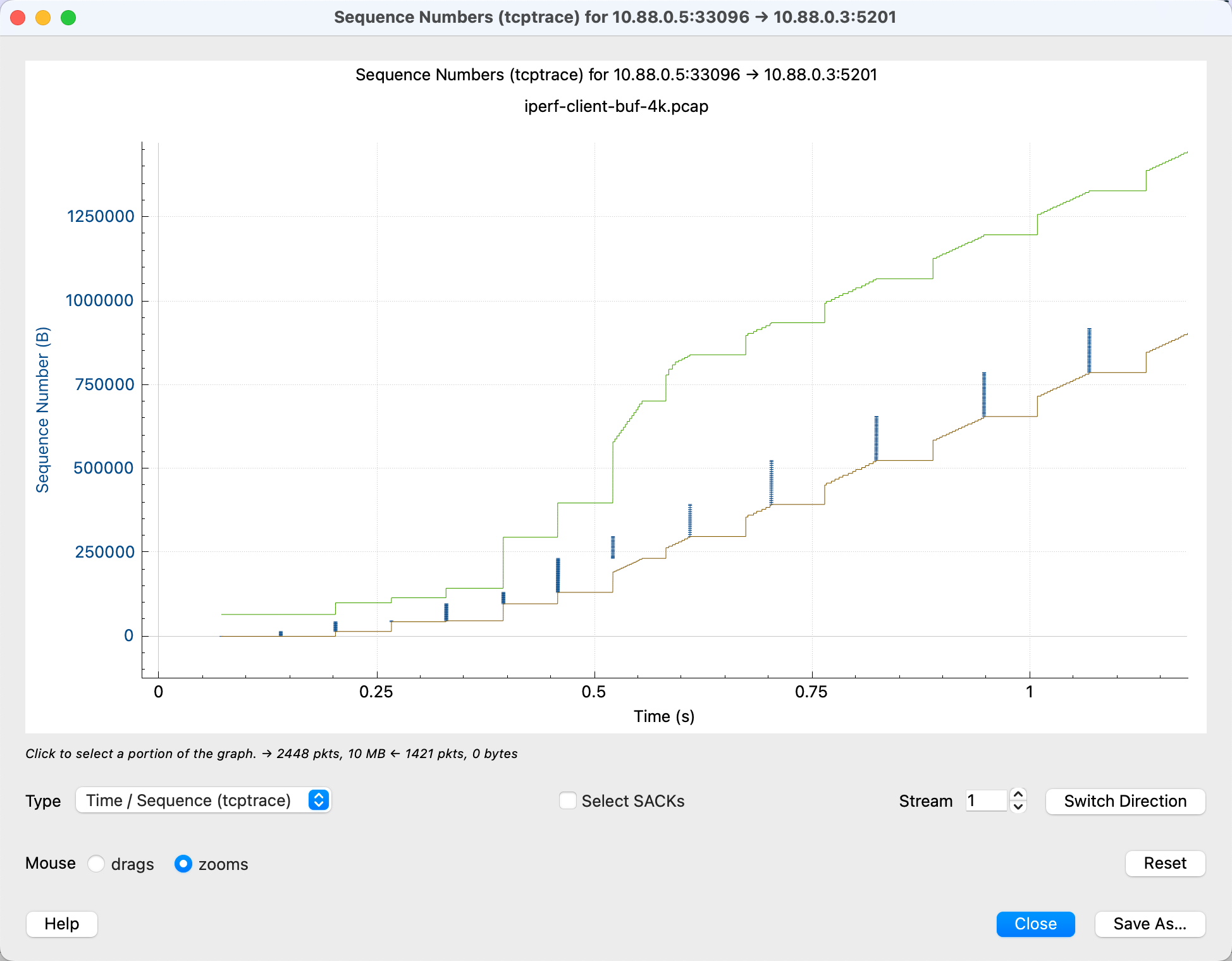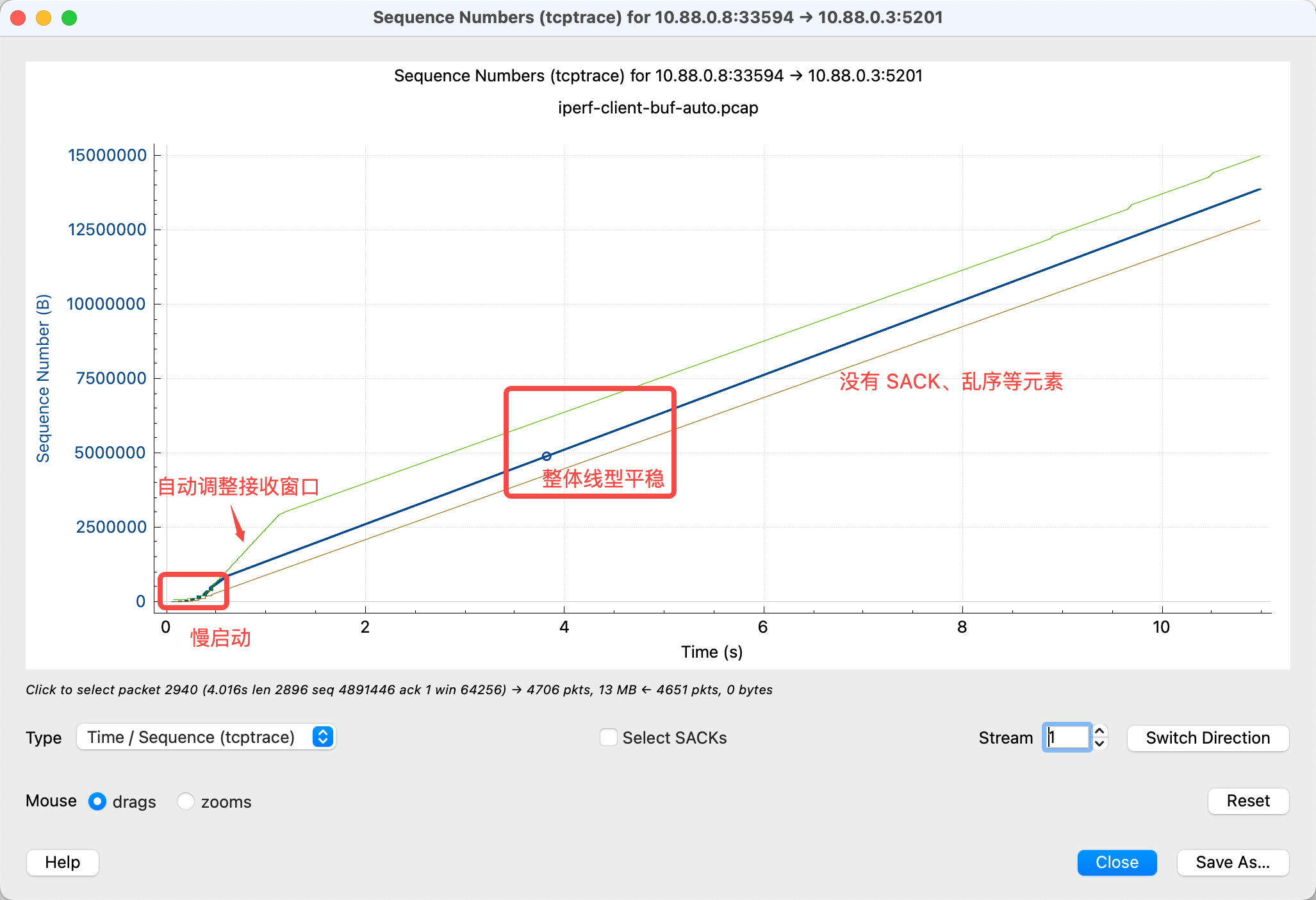 完美的情况下,会是一个非常干净的图,笔直的线,没有 SACK、乱序等复杂元素,也能达到网络的带宽:
