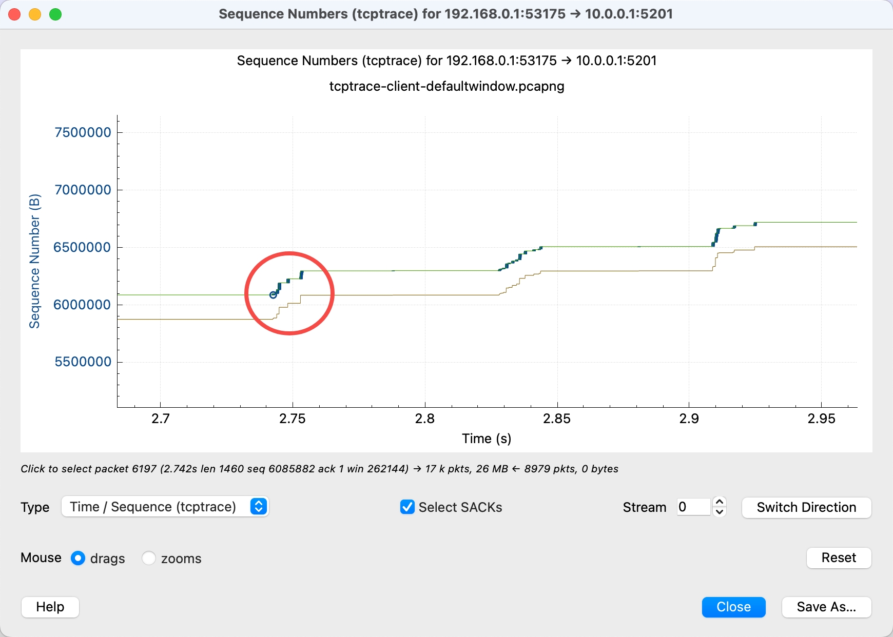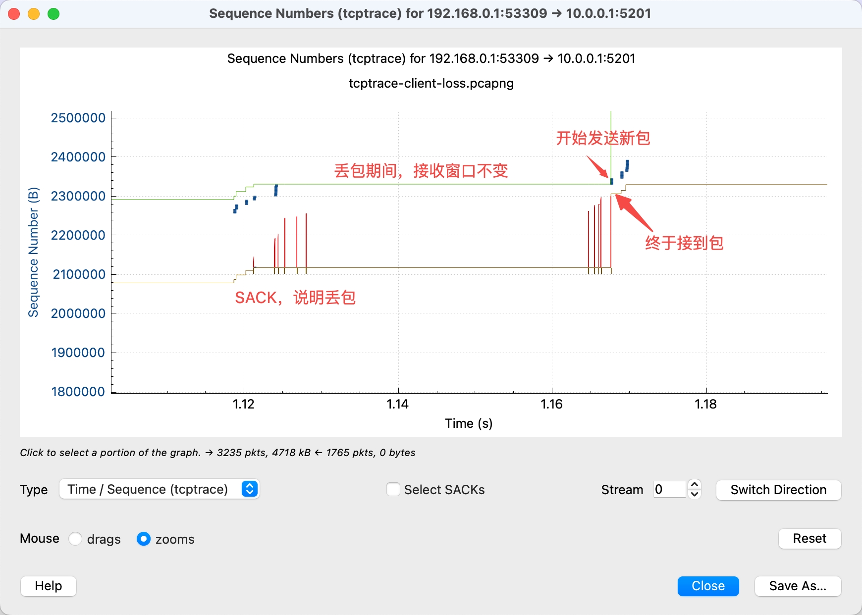 - 看到红色的 SACK 线,说明接收方有包没收到