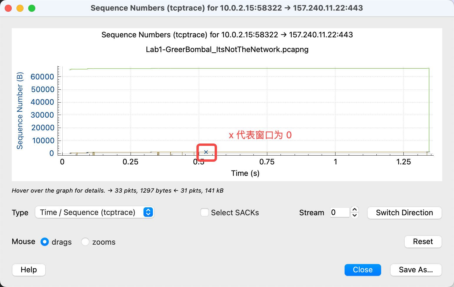 上面提到速率可能跟发送方窗口有关,还有一种特例是因为各种原因(如消费的速度太慢)导致发送方窗口为 0, 此时 wireshark 会特地标记为 x: